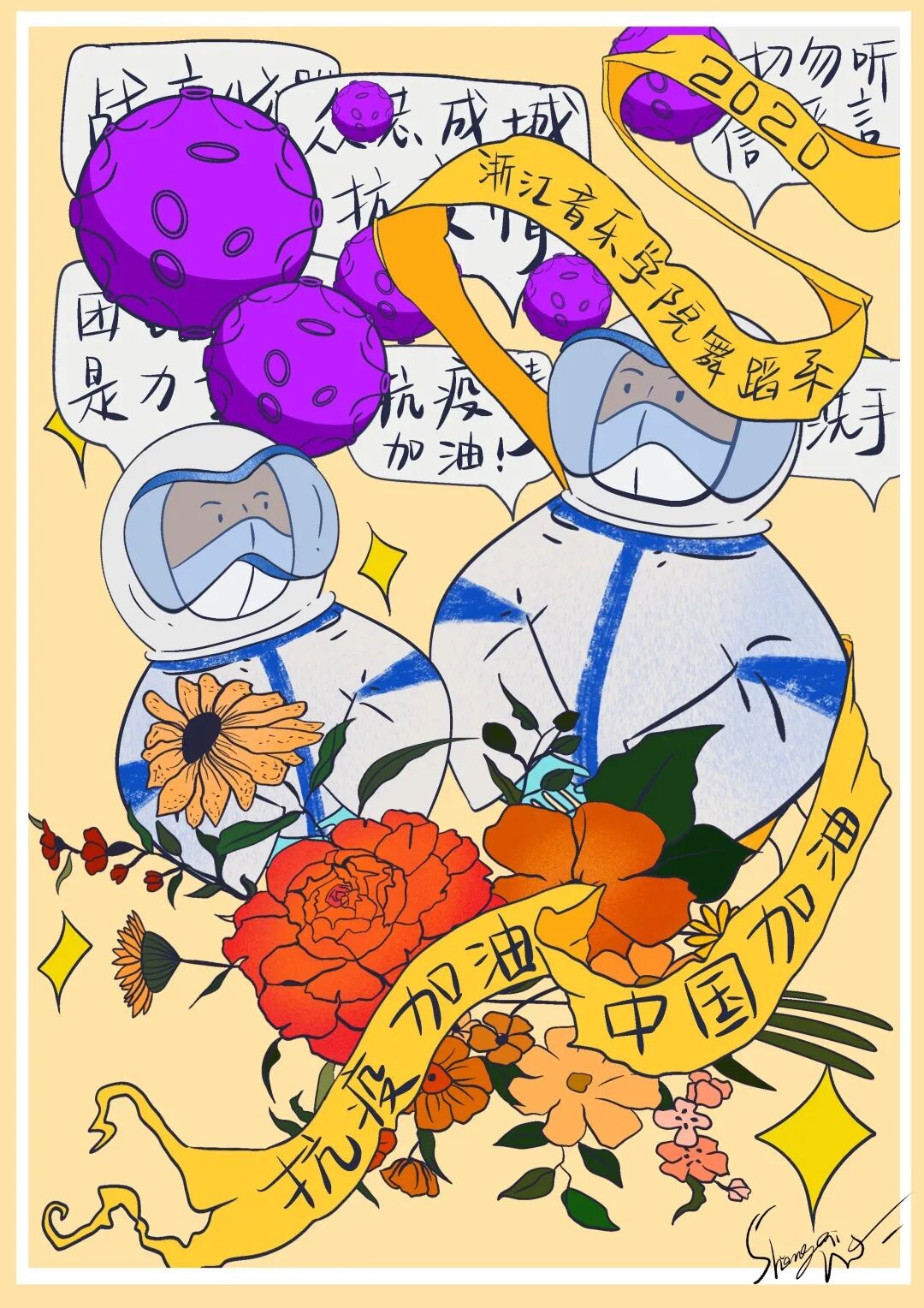 为鼓励同学们利用艺术作品的力量,传递互助和共情,在抗疫相关主题原创艺术作品创作活动中,我们收到了舞蹈、美术、摄影等原创作品,接下来,就由小编带大家走近部分同学的作品吧~ ——芭蕾191蔡一萌 ——芭蕾191李欣雨 ——芭蕾191朱笛萌 ——舞教182韩诗佳、刘淑涵 ——舞编181钟杉杉 ——18研乐欢 ——18研项琳茜 ——18研胡冰融 ——舞表171吴双琦 同学们,新时代中国青年处在中华民族发展的最好时期,既面临着难得的建功立业的人生际遇,也面临着“天将降大任于斯人”的时代使命。 此次疫情防控期间,我系谢乐妍、何珍妮、王唯一等20余名青年团员主动担任防疫志愿者,用实际行动担负起时代重任。 中国的未来属于青年,中华民族的未来也必定属于青年。我们要向无数奋战在疫情防控一线、脱贫攻坚战场的青年学习,把个人理想融入民族复兴伟大事业,不辱时代使命,不负人民期望,书写奉献青春的时代篇章。